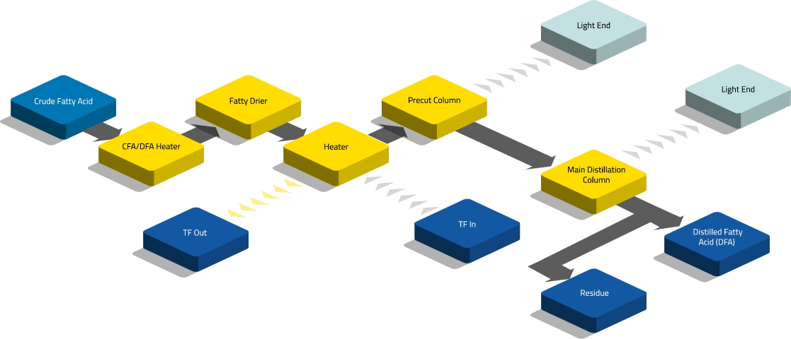 植物油和动物脂肪都可作为生产脂肪酸/甘油的原料。脂肪酸由顶级脂肪酸设备供应商提供的先进装置生产,可形成蒸馏混合物或纯馏分。纯馏分既可通过分馏装置获得,也可以通过选择特定原料并进行直接蒸馏获得。