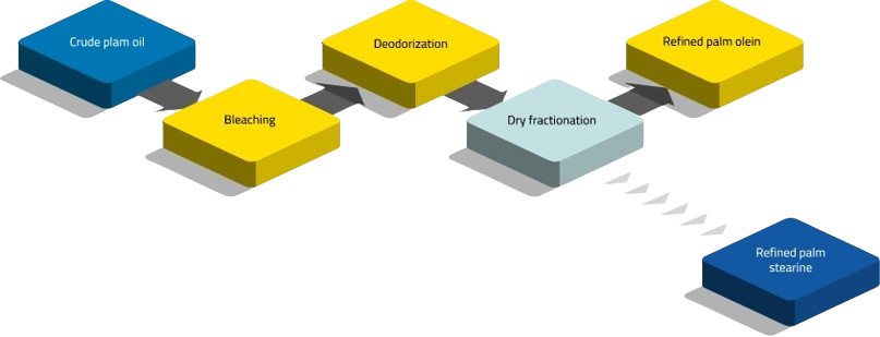 初榨棕榈油含有杂质,会影响油品外观、品质、抗氧化稳定性及保质期。为去除杂质,需将油品送至精炼厂加工成RBD棕榈油(精炼漂白脱臭油)。 精炼后的RBD棕榈油进入分馏工序,从中分离出棕榈油酸和棕榈硬脂。